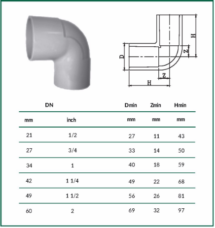 Kích thước co 90 độ uPVC theo tiêu chuẩn ISO1452-3:2009