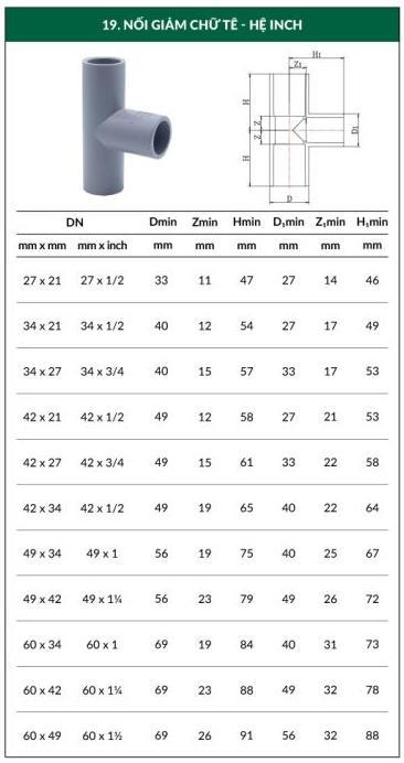 - Dải đường kính của nối giảm chữ tê uPVC từ 27mm - 60mm