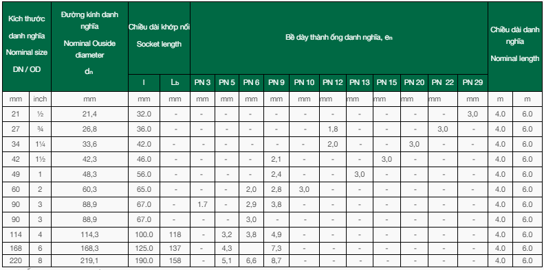 Thông số nhựa uPVC cứng hệ inch - BS 3505:1968