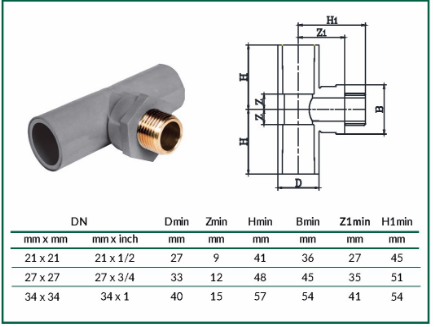 - Dải đường kính của tê ren ngoài thau uPVC từ 21mm - 34mm