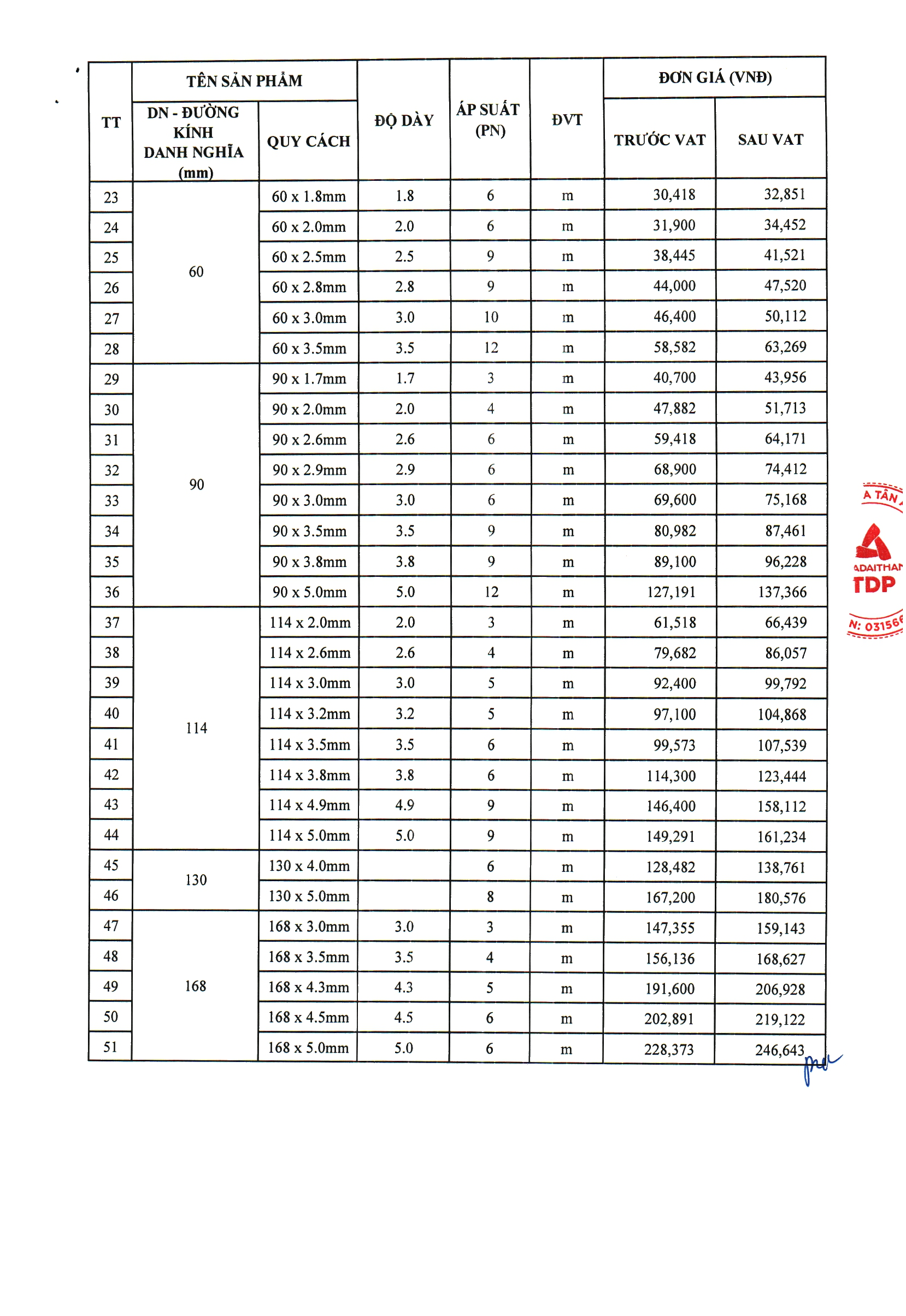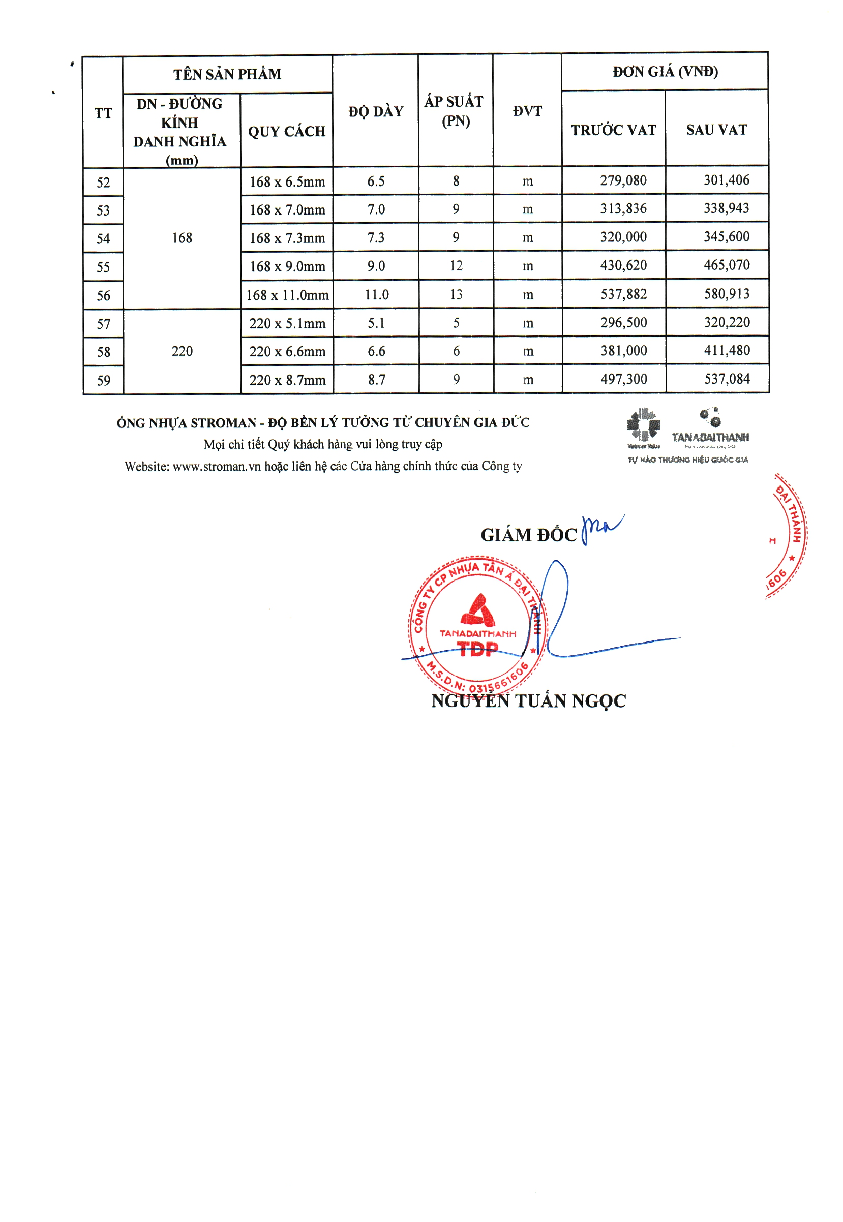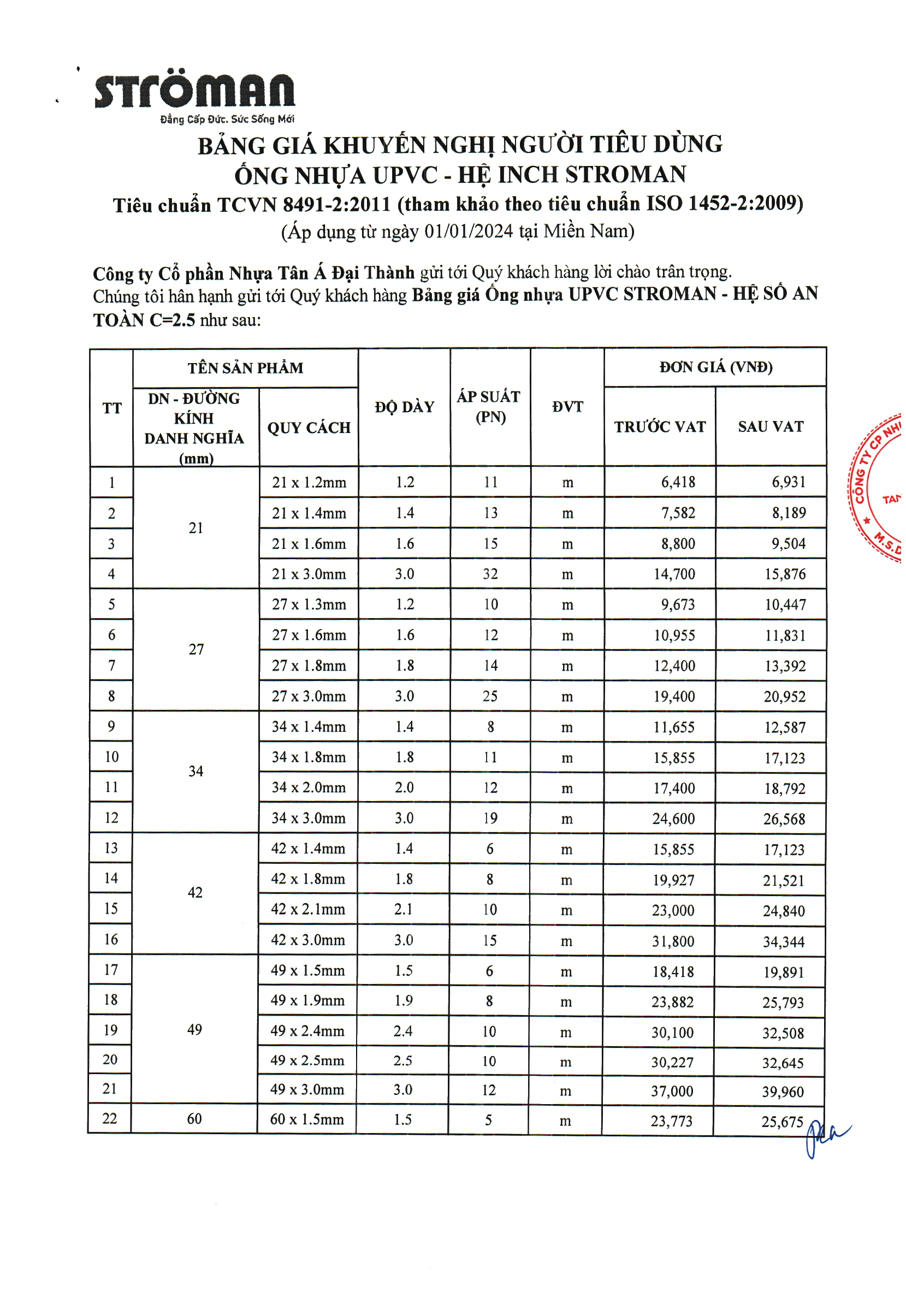 Bảng giá ống nhựa Stroman uPVC hệ Inch