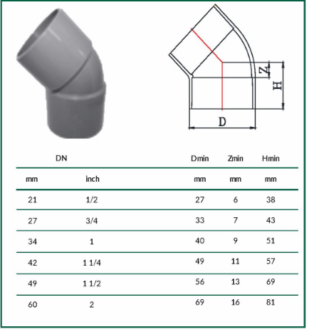 Kích thước co 45 độ uPVC theo tiêu chuẩn ISO1452-3:2009